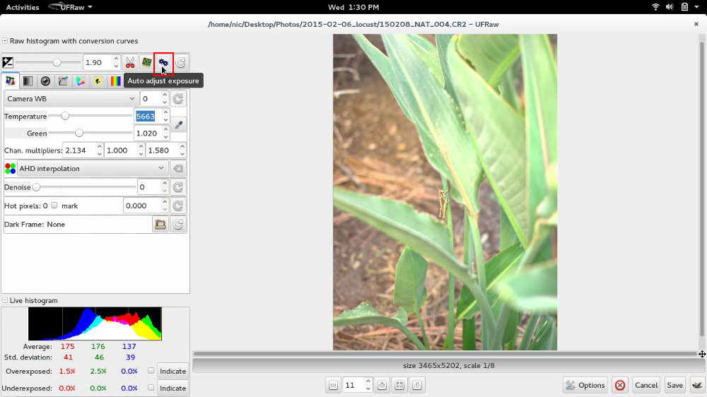 2. We bring up the raw image in UFRaw. First we need to work on the exposure because the photo is too dark. Clicking on the auto gears