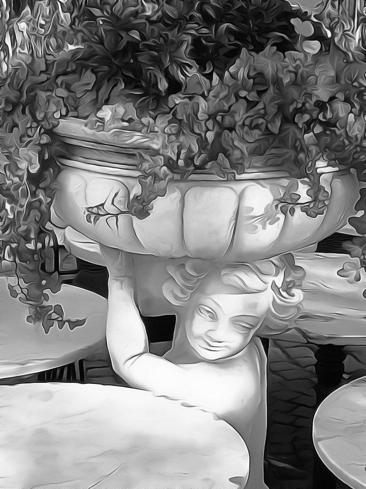 Once I saw the statue in the photo I knew I wanted to focus in on that and do something artsy with it. I tried a few things, but in the end I liked the idea of making it look like it had been drawn and then shaded with greys. I made all my edits in GIMP*.