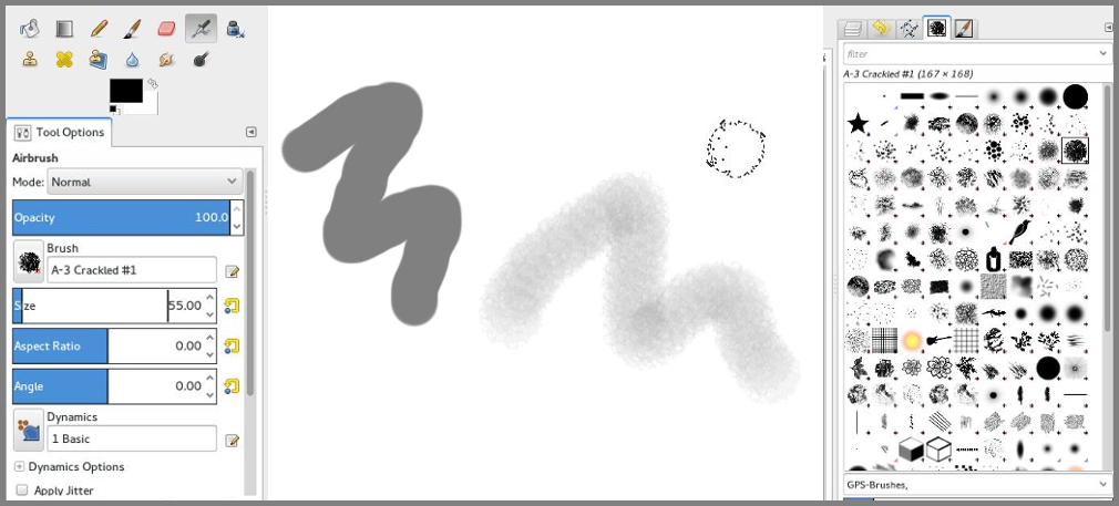 Now for this image I didn’t want to obliterate the background texture, I only wanted to lessen it.  So rather than using the basic paint brush with 100% hardness, I used a crackled brush (from the gps-gimp-paint-studio) and the airbrush tool .  See the difference below (click to enlarge)…