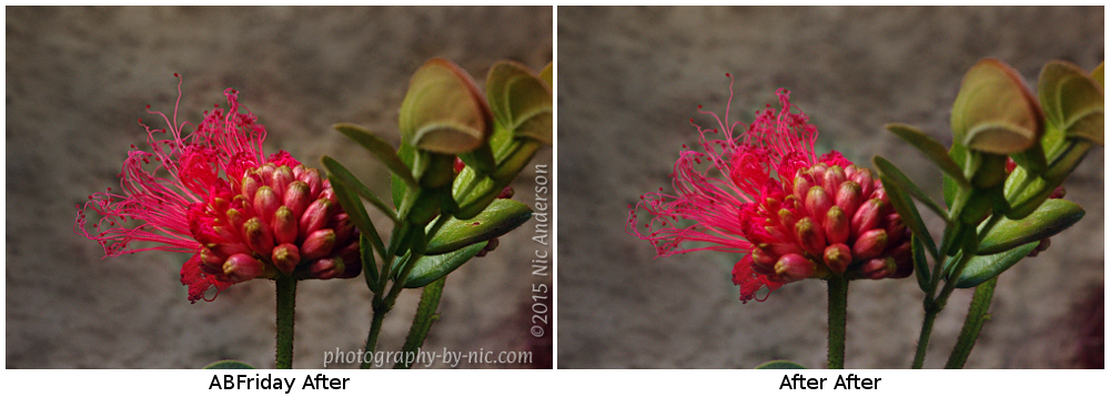 I submitted these images to Stacy for the AB Friday Forum, but I continued to tinker with it.  I noticed that there was some pinkish noise near the flower, and a red blemish on one of the leaves, so I worked on it a bit further…