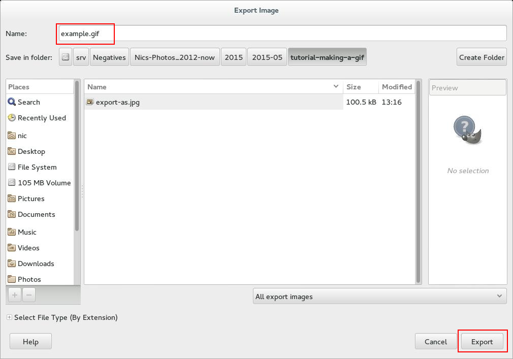 From here you will choose your name and extension for this file. Change the extension to .gif, then click on the Export button (click to enlarge)…
