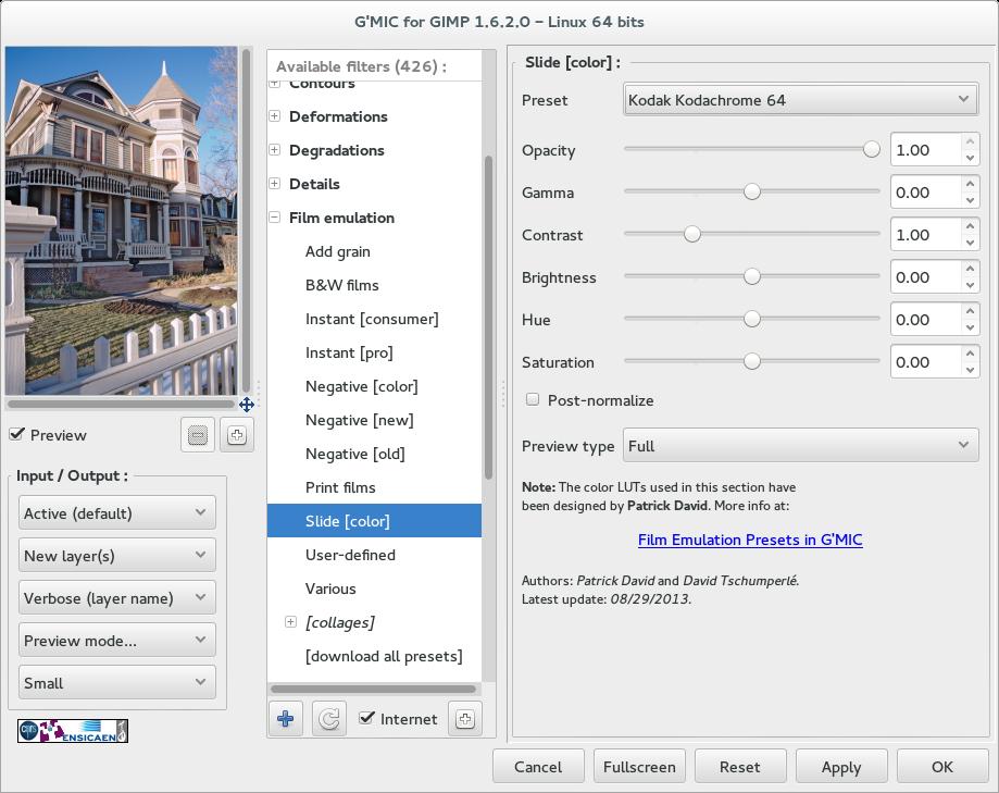 2. Next I used the G’MIC Plug-In Film Emulator.  Originally I was looking for something that would give the look we saw on our TVs back in the 80s where reds are kinda orange-y.  But ultimately I liked the look of the Kodachrome 64 Filter [Filters->G’MIC->Film emulation->Slide [color] ]
