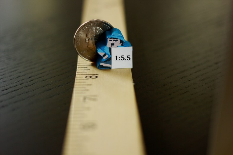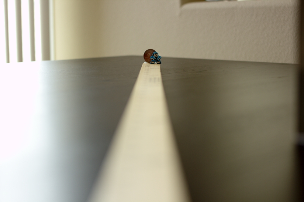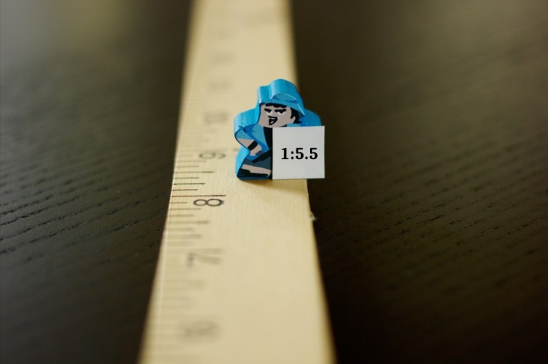 My subjects were all the same size, each meeple was designated to a specific lens so that I could compare photos and know which lens was used. The Professor (light tan) was used with the 180mm, Geoffrey the Orangutan (green) was used with the 50mm, and The Blue Explorer (blue) was used with the 40mm.