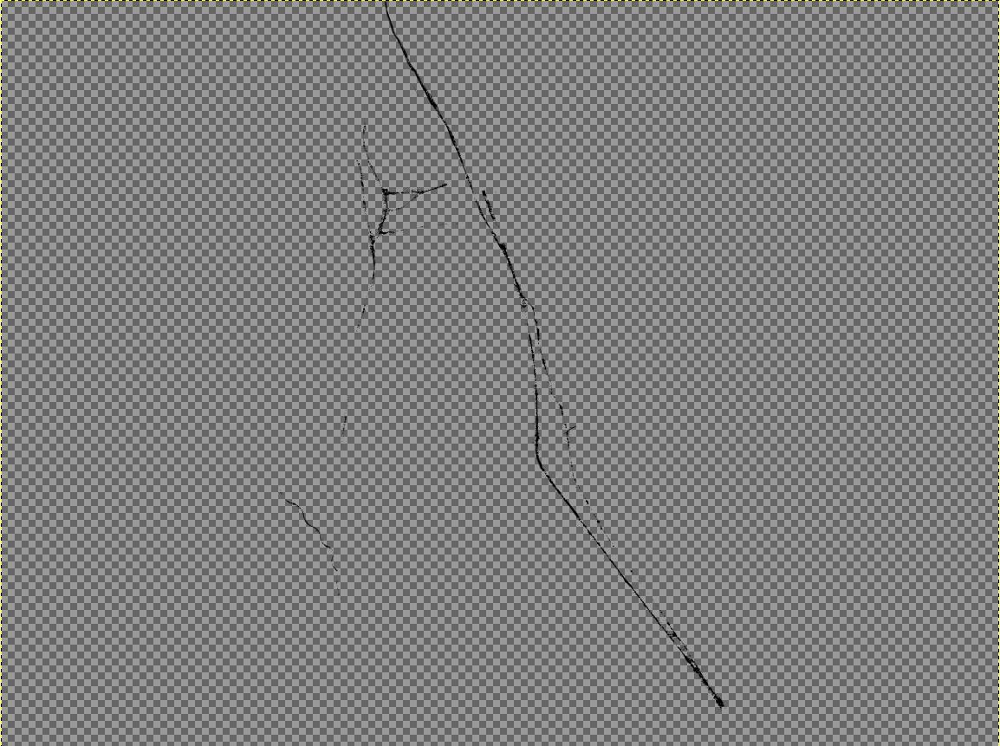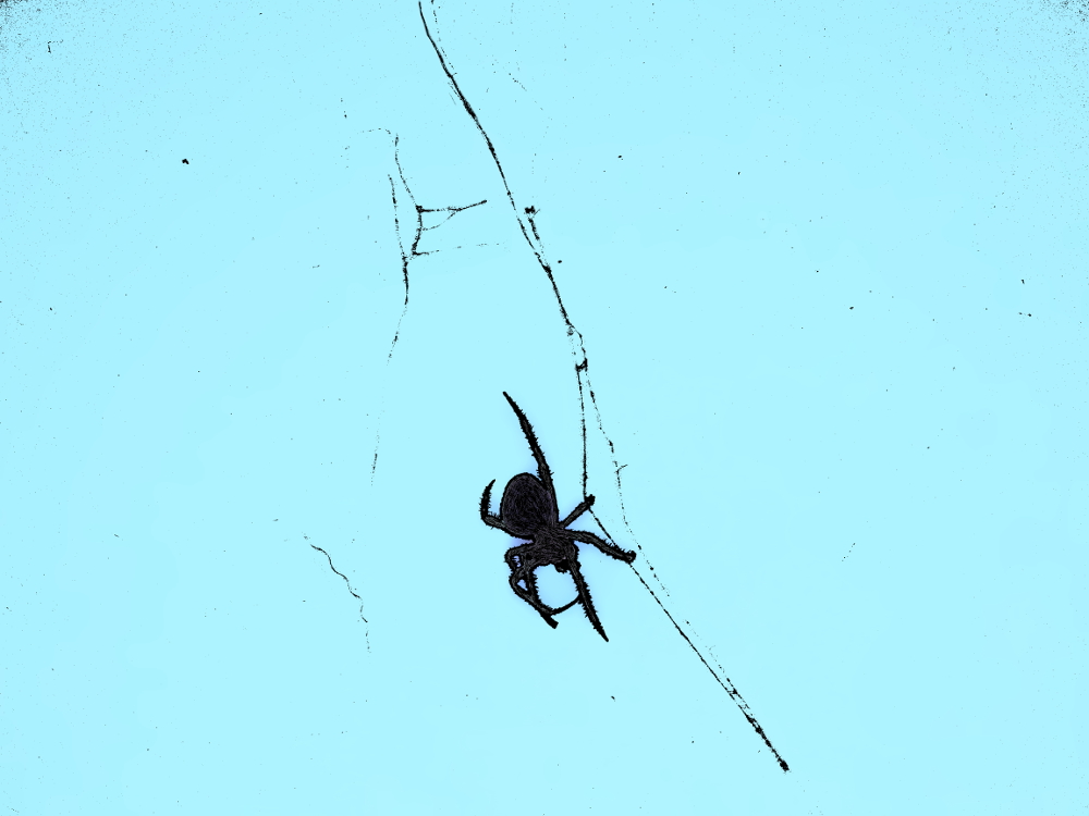 4. You may have noticed that the web is simply not visible, which is a problem… it really helps with the not-floating spider, and the creep factor.  So I pulled up last week’s threshold image and played around with that.  First I made a copy of that layer, then I stared to erase the big black patches in the corners.  It proved to be a nightmare to try to carve out the web by hand, even on my wacom… so I decided to just focus on the big lines of web and this is what I ended up with (the checkered background denotes that it is transparent)…