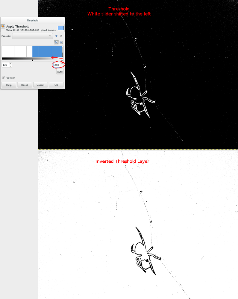 2. I’ve been trying to figure out how to make the spider web more visible.  Last week I played around with Threshold [Colors->Threshold], where I pulled the black slider towards the right and got a great creepy image.  This week I decided to see what would happen if I pulled the white slider towards the left… it had an interesting result.  I noticed that at a certain point the image shifted from white/black to black/white.  (Your results may vary, my histogram shows that I only have a small amount of data which is very close to the right side… which is probably why I’m getting these results.)  Then I inverted the layer [Colors->Invert].
