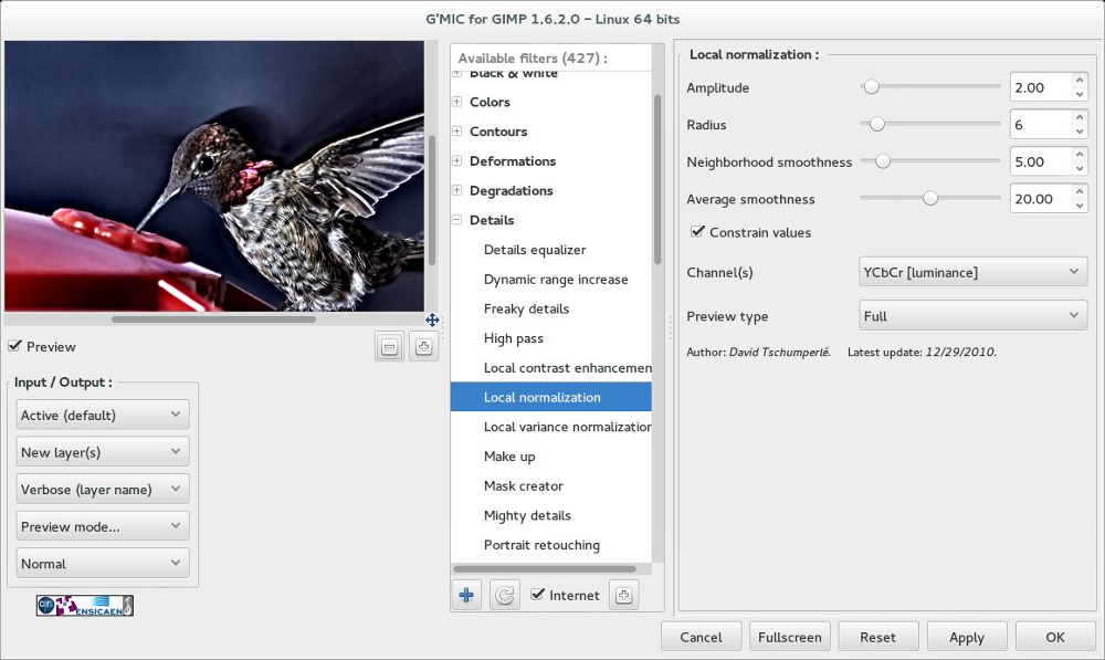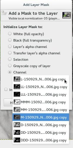 3. This next step is rather convoluted, but you don’t have to do all the steps I did if you don’t want to.  I chose to duplicate this next filter layer 9 times so that I could see how each Luminosity Mask looked by themselves and then combined.  It’s part of my experimentation this month.  You can get a great edit by only choosing the M channel, I like having the extra control of seeing several of the possibilities.  So like in my previous post, I decided to add a Local Normalization filter (which is in the G’MIC Plug-in2 for GIMP) [Filters->G’MIC->Details->Local Normalization] using the Visible Layer I created at the end of step 2.  I used the default settings. local-norm-gmicI also made sure that my input/output settings were set so that the filter only worked on the current layer, AND created a new layer with a descriptive (verbose) label.  gmic-input_outputThen I created a duplicate of the filter layer 9 times.  For each of the duplicated layers, I added a different Luminosity Mask (selecting a different channel each time).  Be sure to turn off visibility (the eye icon eye) for the Local Normalization layer without a mask.