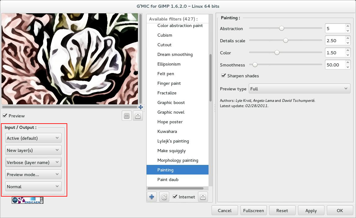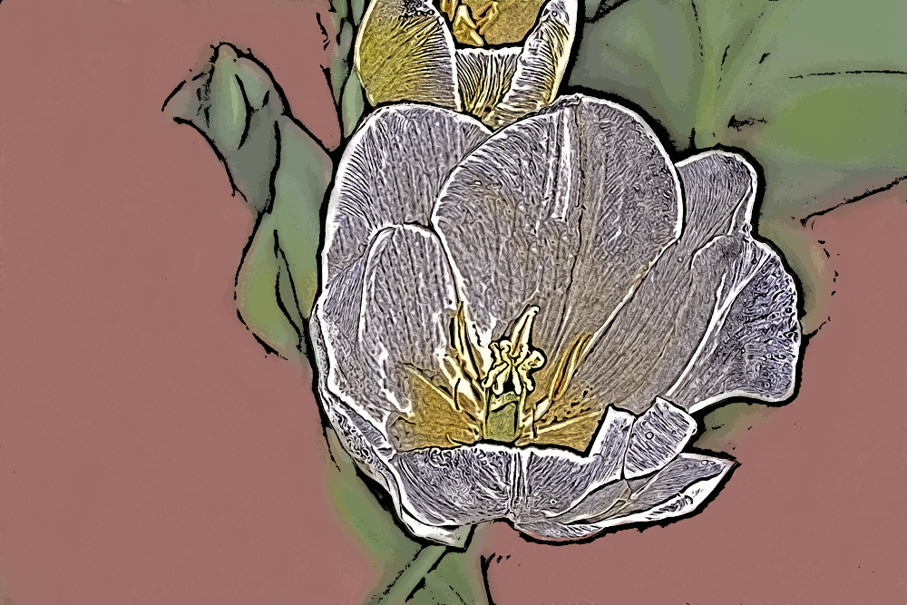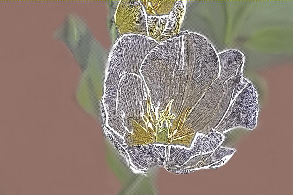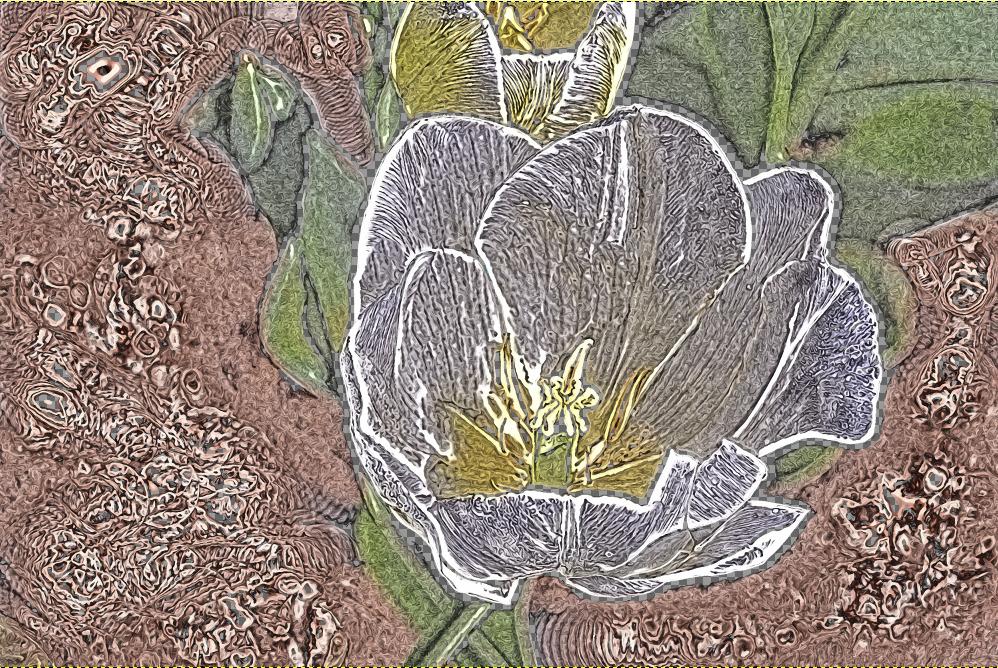 4. Then I ran a paint filter from the G’MIC3 plug-in [Filters->G’MIC->Artistic->Painting].gmic-painting  The crazy spiral marks were made because of the airbrushing in step 3, but I plan to blend that anyway so it’s ok.  paintingWhen I did not removed the hard shadows, the filter didn’t understand where the edges of the flower were.  Also I didn’t like the dark parts in the background.hard-shadows-painting