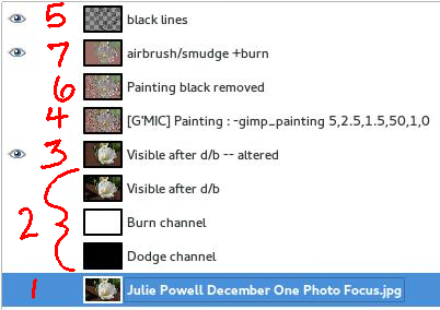 2. Next, I ran a dodge and burn script in GIMP1 to make the edges stand out more for the filter I plan to use a bit later [Script-Fu->Enhance->Dodge and Burn].  Then I made a new layer from visible [Layer->New from Visible].  It is subtle, but the edges have a harder edge with will help with the filter in step 4. dodge-burn