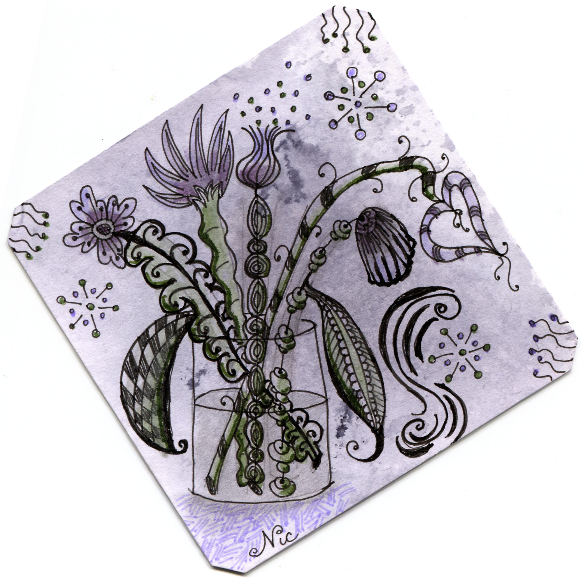 Then I played around with trying to color the paper first, then tangled on it, and then used more color to accent it… my inspiration was a little vase of flowers I have on my table (on a 3.5 inch square artist tile)…
