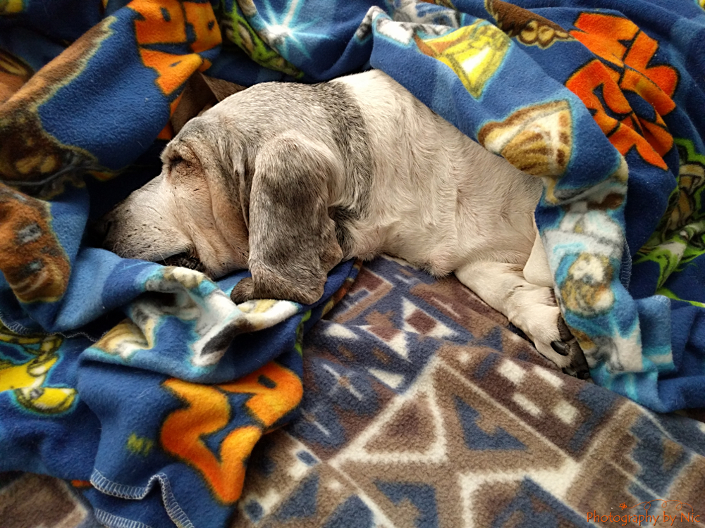 After a long day of x-rays and an ultrasound (not to mention missing three meals 1) yesterday, my girl is zonked out this morning (on my bed)…