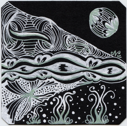 Playing around with black paper and white gel pens (plus a touch of color)… Enjoy…