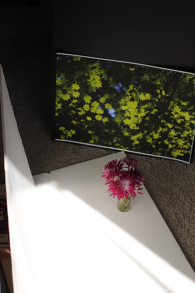 My idea was to use a printed out photo that I took of leaves as the backdrop to make the indoor photo look like it was taken outdoors…