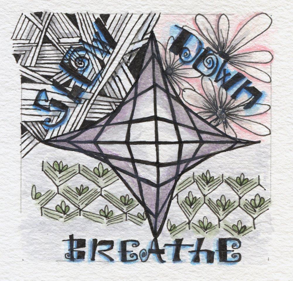 I had a bit of trouble with I’m the Diva’s weekly challenge #278 UMT (Use My Tangle)… knightstar.  It’s not that I didn’t understand it, I just didn’t seem to be able to execute it well and then would get confused while doing it.  It took me days of trial and error, I even tried out a different way of doing it.  But in the end I did it the first way… and once I sat down and committed to focusing on it, it came together.  Then I added some lettering, and some other tangles (balloya, daisy idea here, bandola), shading, and color.  I made some mistakes on balloya and resorted to using white out (yes I know, it’s cheating, I should have just gone with it)… in the end I’m not sure if I was just trying to hard, not listening to the tile’s advice.