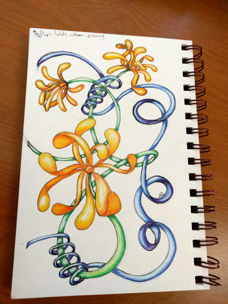 I purchased and read another ebook… Flips, Folds, Ribbon, and String – this isn’t zentangle per se, but it is nice to think about how things wrap around so that you can make really neat art.  I made a LOT of mistakes, and erased quite a bit.  Once inked, it didn’t quite look right, so I got out a ribbon and realized I had switched a few parts the wrong direction, so I used a white gel pen and used it like whiteout…. not bad for a first try…