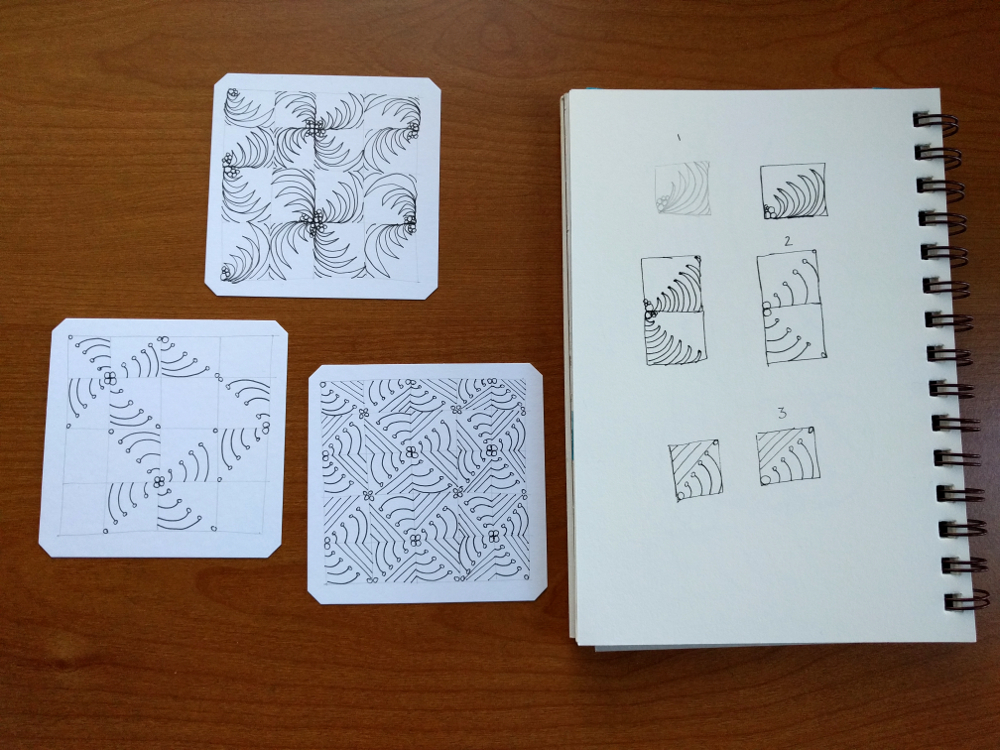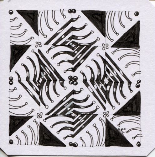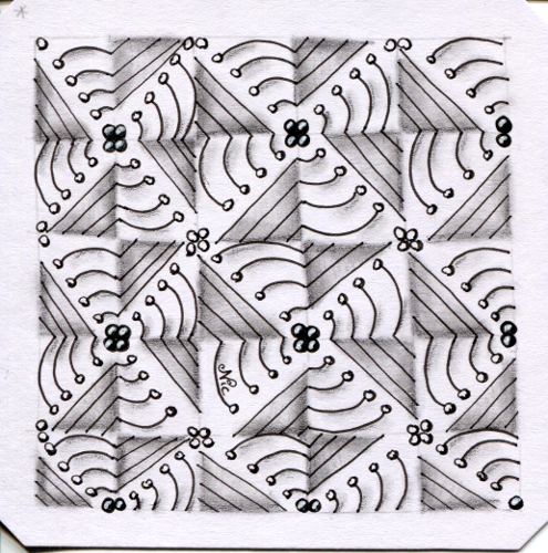 At first I was trying to use circles and arched tentacles… but when I went to put in in the grid, I kinda lost my place… it was neat, but I wanted to see what else I could do.  Then I tried a large circle, then several small circles diagonally up, then connected with a curved line.  Interesting… but again I got lost on my implementing of it.  The third time I paid special attention to where the center four should fall and then those around it… then I decided to add a diagonal line and was surprised and thrilled that it could connect to the curved lines and make an interesting shape… I was very happy. 😀  and created this tile…