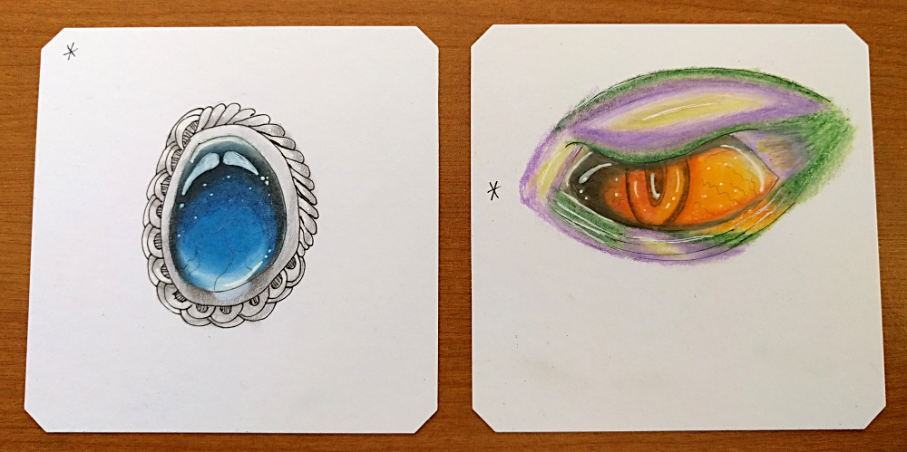 At some point, I decided that I wanted the eye to look shiny like a gem… so I read up on one of my ebooks, 3D Tangle: Shading Smooth Gems.  I practiced a gem, then I drew an eye and practiced on it… awesome!