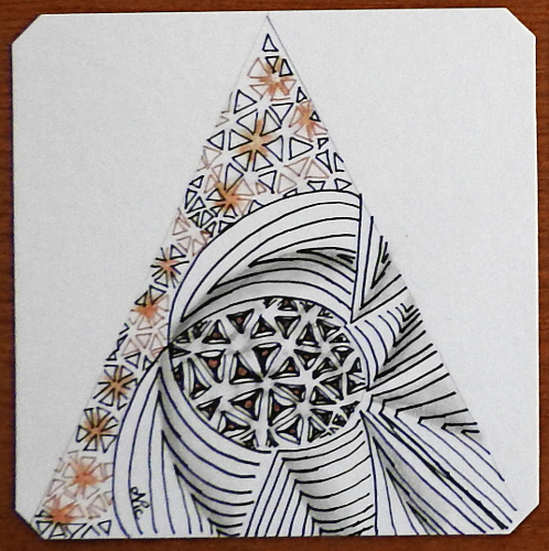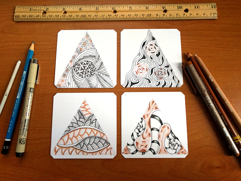• Thanks, Kate! 🙂 Yeah at first I thought I’d just draw a line to the center of the top to make a triangle… then I read the description again and thought, hmmm that’s not equilateral… So I figured out that the point would come down a bit and the angle was slightly wider… having them all the same will make the mosaic fit together better. 😀 I thought about ‘fixing’ the two that are a bit long, but it still wouldn’t fit right because the angle isn’t the same, so I’m leaving it — in true Zentangle fashion. 🙂