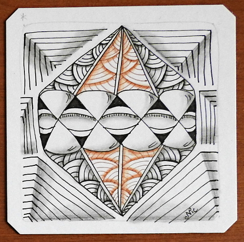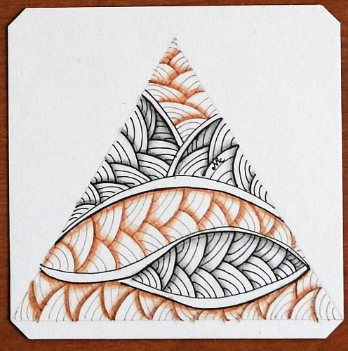 Also I’ve been noticing a few other tanglers of zen using a bit of red in their tiles and I thought it looked cool.  It turns out it is a sepia pen.  For shading I used a Burnt Ochre colored pencil and a blender pencil (see image above).