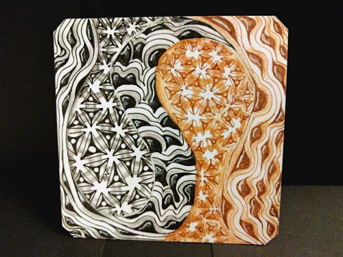 Day five’s pattern was Tipple, I created two sections of tipple – one, bubbles some that pop; and the other, I like to think of pebbles and silt being moved into a cove by water. My husband said that it looked like the snails were having a party, I said they were drunk on rootbeer. 🙂 Other tangle patterns on this tile include: a shattuck/keeko hybrid, marasu, and b-twixt.