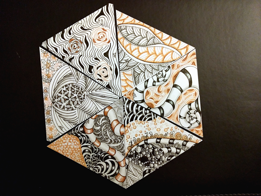Day six’s pattern was Molygon, I love the wormy look I created with this one. Other tangle patterns on this tile include: tripoli, marasu, triangular shattuck within molygon, and nekton.