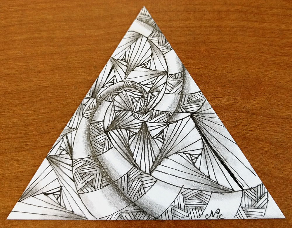 I’m waaaaay behind on the 12 days of 3Zs, this is for day 7* which is the pattern Knight’s Bridge. I paired it with Paradox, I finally figured out how to make it more of a pattern, I think I normally put down my next triangle willy nilly and never got the fan or twist. This time I paid attention to get the fan shape. Yea! 😀
