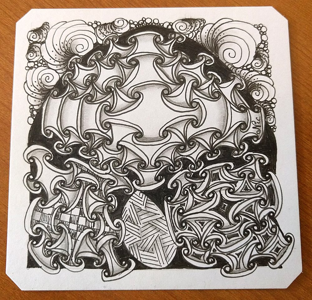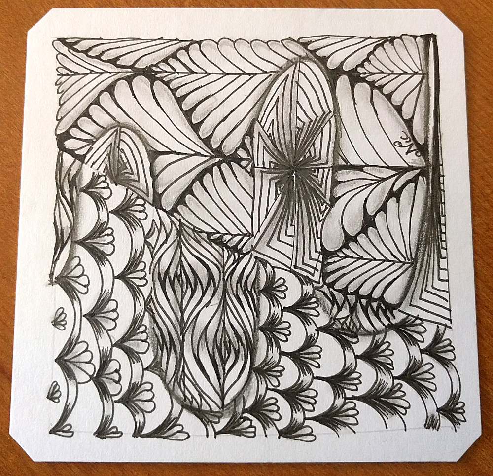 My husband had to go out of town on Tuesday, so it was just me and the pup… I tangled some zen, read, and watched some youtube videos on art techniques. The pup wanted to know when he was coming back, and went into his office to see if he was there…
