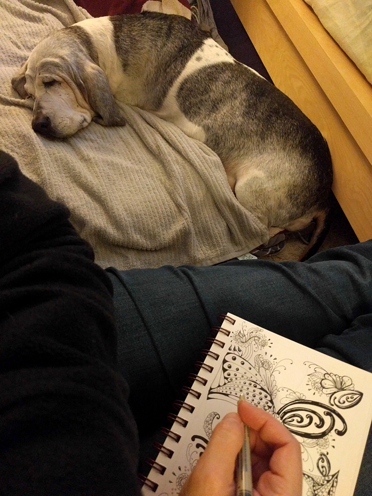 My pup, Scarlett, isn’t feeling very well lately.  The Rimadyl at first turned her into a SuperGirl she had strength in her back legs and was walking pretty well on her own (even if for shorter distances than in her youth).   But as time wore on she stopped wanting as much food and always had an upset stomach.  This weekend the upset stomach really reared its ugly head and Saturday was not fun for anyone.  She has to go ‘out’ often and none of us are getting any sleep.  When she felt that bad she refused food, and if I added something really appealing like peanut butter (which I did on Friday) she’d eat it then her upset stomach would really get mad (which was Saturday).  I couldn’t get her to eat until late Saturday night, and so she didn’t get any of the Rimadyl (because it’s take with food) and I finally got her to take her medicine early Sunday morning (5am).  She gets up about every two hours during the night to go ‘out’.  I’ve decided that today I won’t give her anymore Rimadyl because once I got her to finally eat again on Monday (after buying her food in can form), then the upset stomach lasted hours and again none of us got much sleep… that’s 4 nights now.  She has an appt with the vet tomorrow, but today she’s refusing food again.  Luckily she’s still interested in water, but she is getting so little and I am really scared that I’ll have to make a ‘quality of life’ choice soon. 😦  I hung out with her yesterday while I drew, she was up and about and decided to go lay on a bed in the back room that she hasn’t used for awhile (because it is far from the ‘bathroom’ on the balcony)…