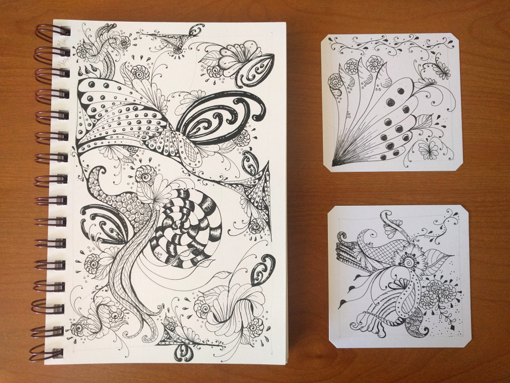 When I started this I was trying out the idea of having my work be more free flowing, inspired by PeterDraws I searched the internet for Mandalas and then came across Henna designs… I played around a little bit, but found myself *wanting* the structure of Zentangle’s string confinements so I added some pencil marks to add in a string after the fact… I think it helped.  Then I stared incorporating some of the Zentangle patterns I like lately with some of the Henna designs I found…