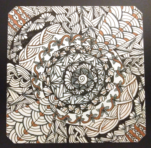 Then I searched TanglePatterns.com for ‘Ribbon’ tangles that caught my eye.  The interesting thing here is that this looks like how my brain was feeling the last few days… crazy.  We found a leak under the kitchen sink and after the inspector stopped by, our apartment complex is relocating us to a hotel for up to two weeks!  Basically they are going to crack open a section of my kitchen, remediate it, then remove the affected parts and rebuild sections of my kitchen.  Ugh!  The next few days we are packing up parts of the kitchen and figuring out what we will need for two weeks.  Needless to say things are a little bit stressed right now.  It feels so weird to have to leave your house for an extended period of time.  It’s not like going on vacation because knowing that someone is demolishing your kitchen while you are away is unnerving.  Anyway, I feel this tile represents my current state of mind, ha ha…