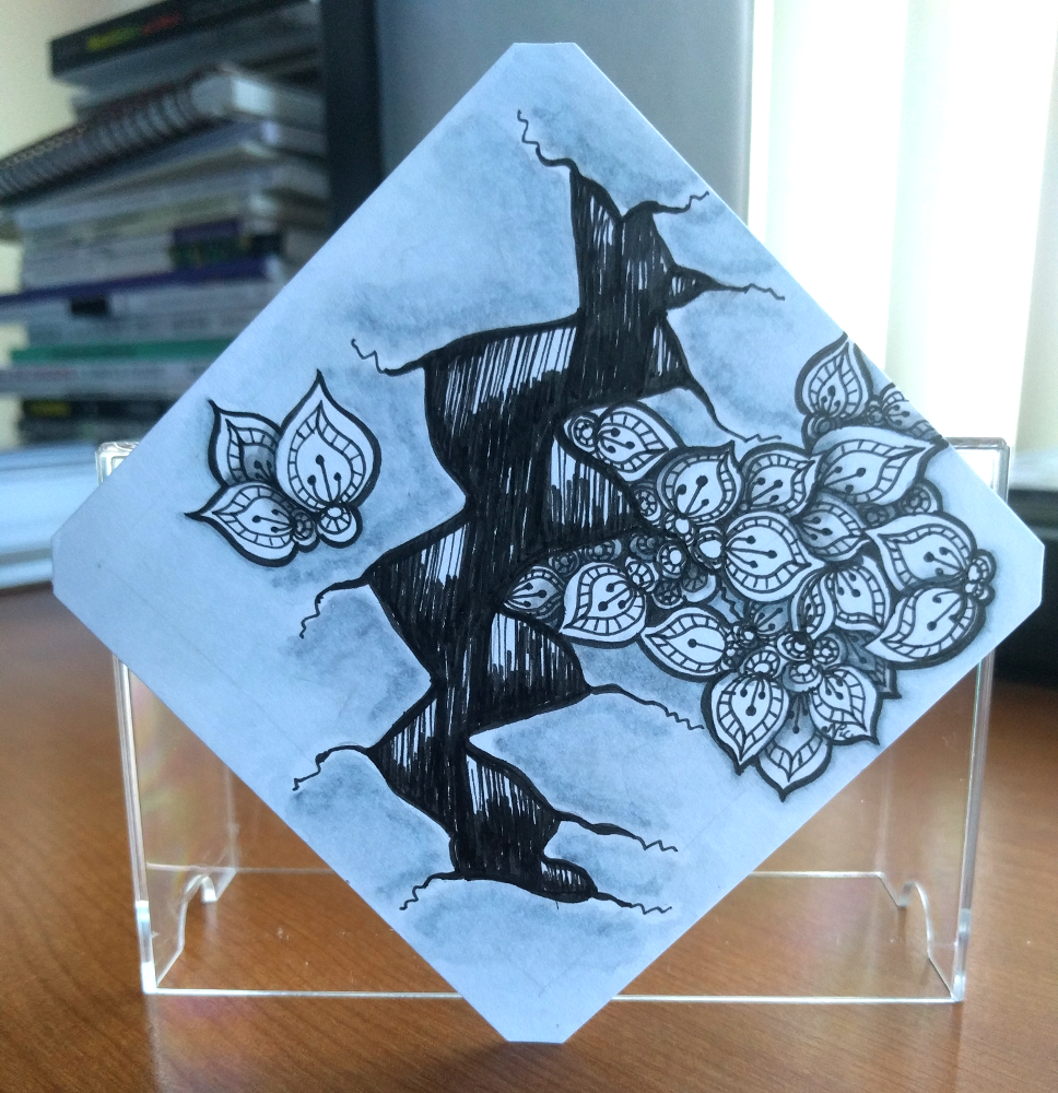 At first when I was thinking about what to do for Divided, I thought of a mirror image. Then I thought of making it look like a torn sheet of paper to separate the page. But when I was researching how to draw a torn sheet of paper I came across images of cracks, and then I knew that is what I wanted to draw. I watched some of this video to help me get an idea of how to draw a crack. After watching the video, I drew a chasm with the Dicso tangle on one side and a few Dicso tangle pieces on the other to Divide them…