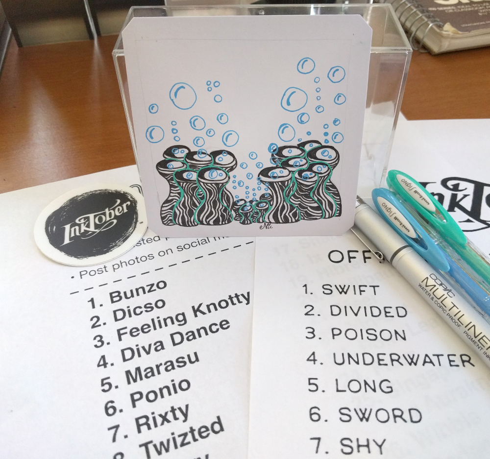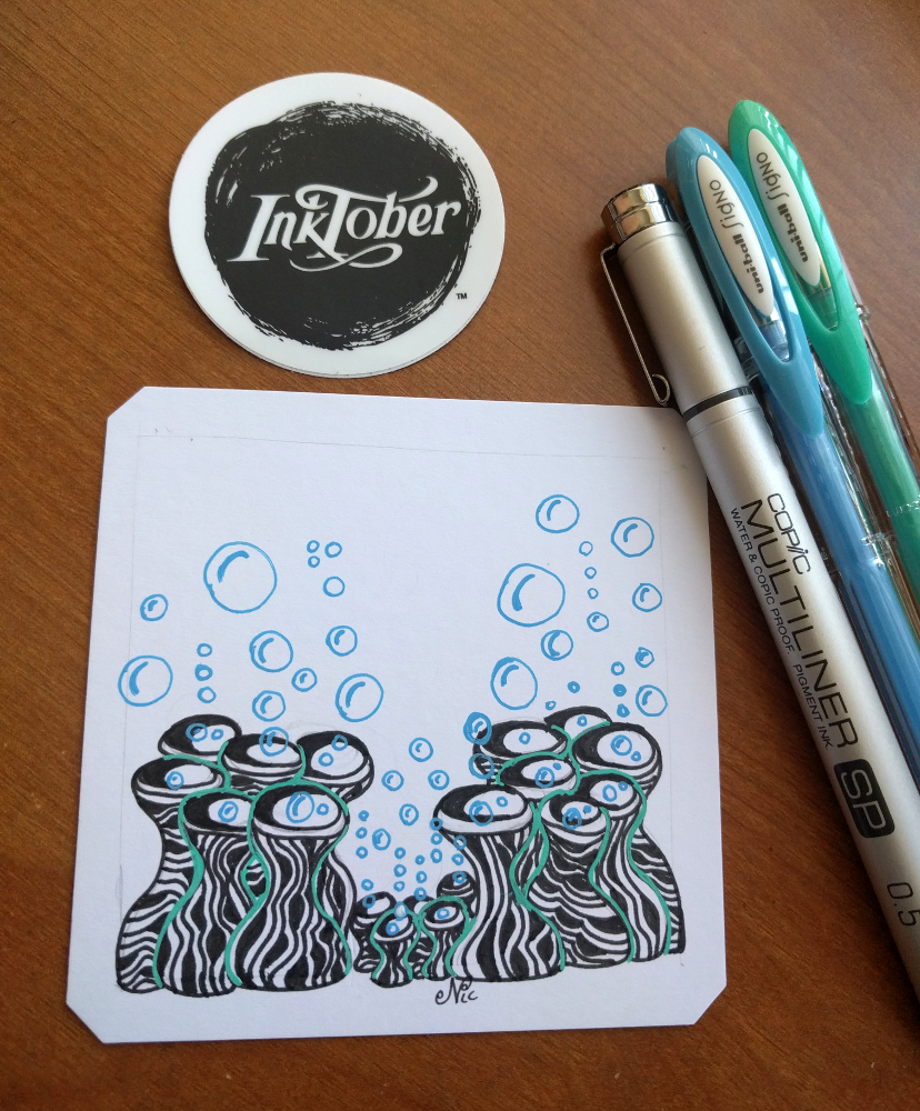 ***Full disclosure, I did day 4 on day 7 because I ran out of time on day 4.*** I had the idea of creating coral with the Diva Dance pattern… my first attempt I didn’t like, on my second attempt I came up with these little cylinder type things (pods?) with the Diva Dance pattern on them. I drew some bubbles to make it seem like it was Underwater. The zentangle pattern kind of made the individual little pods blend and hard to distinguish, so I used a green gel pen to separate them…