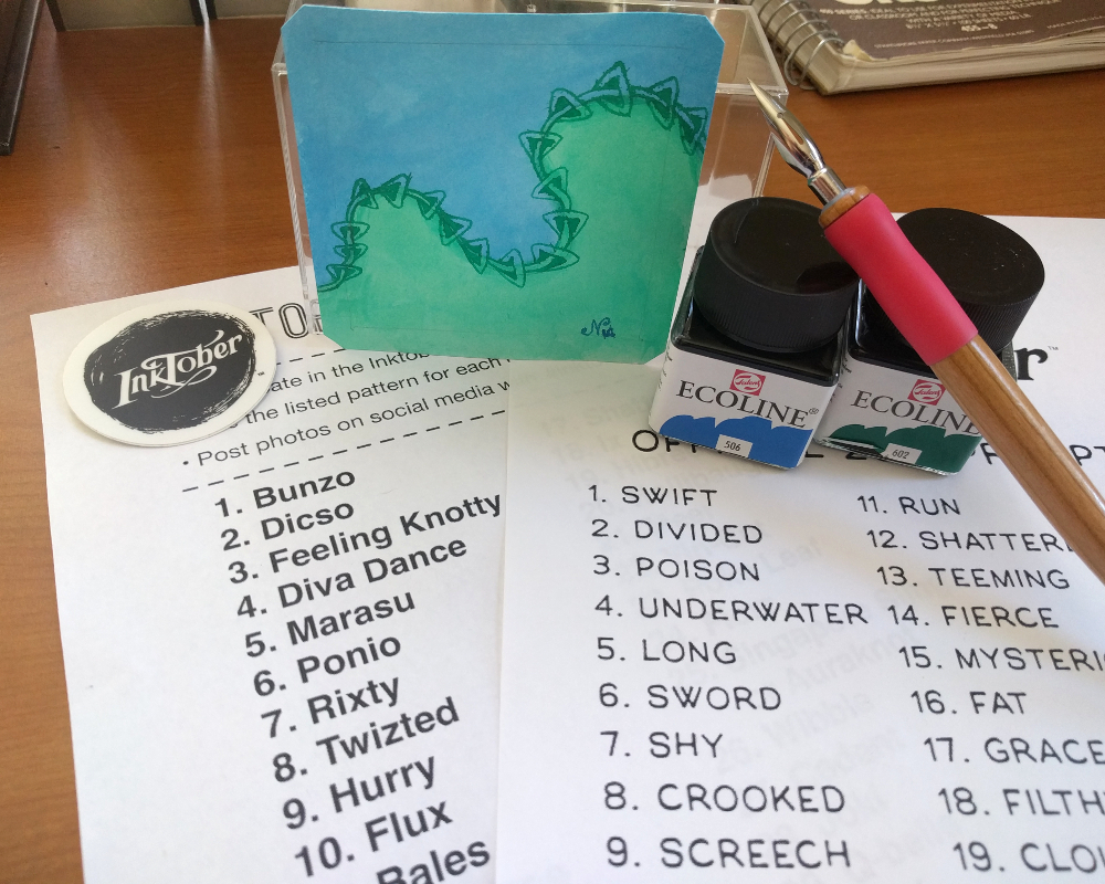 I had a bit of a hard time coming up with something for the prompt Shy, to be honest my brain just kept singing Too Shy by Kajagoogoo. I finally decided to just sit down and play with the zentangle pattern Rixty and see where it took me. First I drew a wavy line in pencil (my string) that kind of looked like an ‘S’, I briefly thought about writing the word ‘shy’… but abandoned the idea pretty quickly. Then I thought about playing with color and how I was being ‘shy’ with color so far in the Inktober Challenge. Then I thought of NOT being ‘shy’ about experimenting, hence I used the liquid watercolor as my ink for the fountain pen nib.
