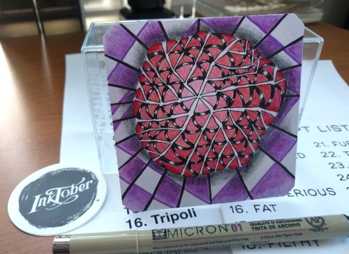 Today’s prompts had me thinking for awhile… first of all, Tripoli is a challenging zentangle pattern (at least it is for me) – it requires deep concentration to keep everything in line. I had to practice Tripoli quite a few times before I got the hang of it mentally, then I altered it with a rounded side, which required lots of concentration. I watched this video and it helped a bit.