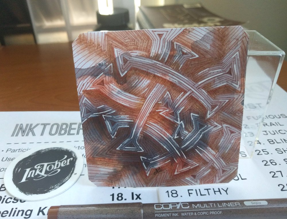 Today’s prompts were a bit more difficult… I wracked my brain for what to do for Filthy… at first I thought about adding brown watercolor to simulate mud, but then I told myself that I was ‘cheating’ for that prompt because I wasn’t drawing it in ink. So I continued trying to figure out what to do, I tried to draw a mud splatter, but I just wasn’t feeling it and tossed it aside. Then I told myself that it was my tile and I made the rules… and there is only one rule: Be creative this month, everyday. So I went back to my original idea and made a splatter with brown, black and white watercolors to be ‘filthy’. Then I tangled the zentangle pattern Ix all over the filthy tile. I’m glad I went back to my original idea, I think it turned out rather neat. 😀
