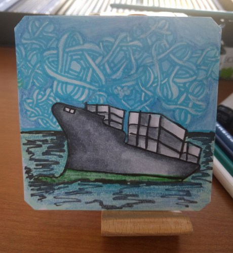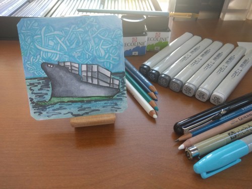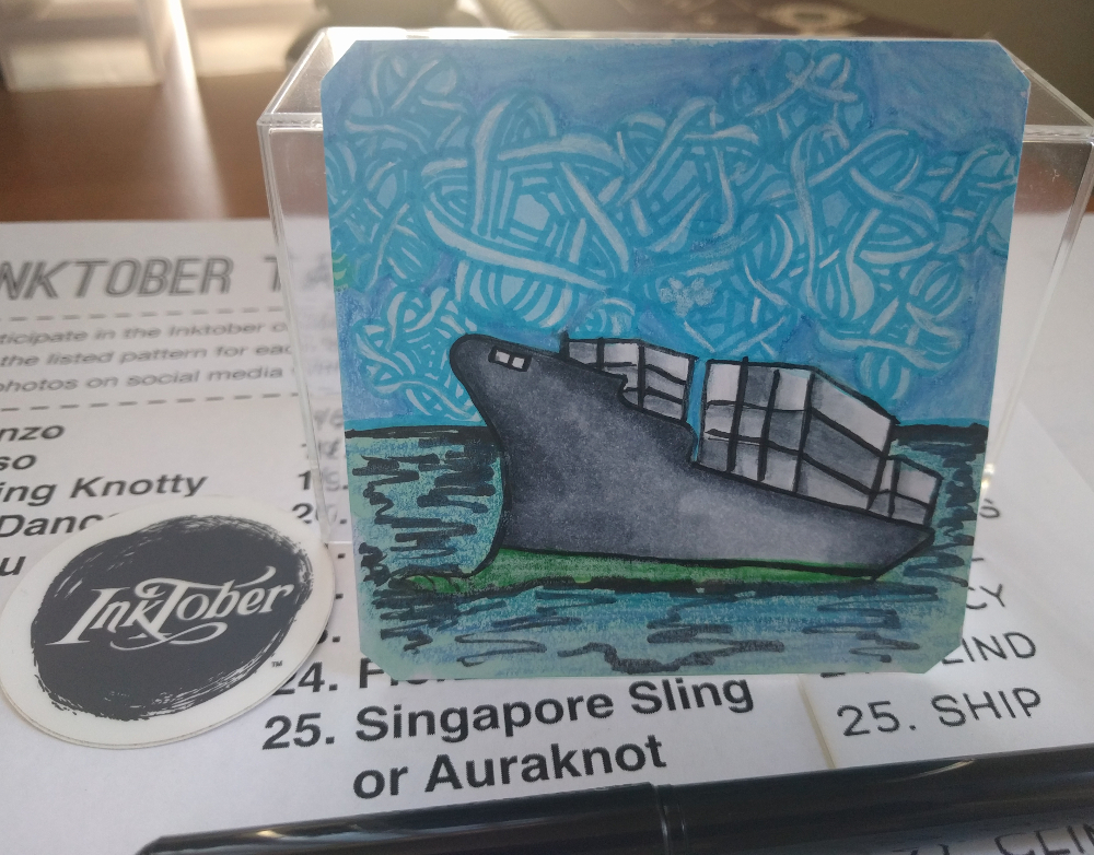 I’ve got to say that this inktober exercise is helping me be more willing to try things that I might not have tried before… both in materials and in attempting to draw objects that aren’t abstract. Today’s prompt of Ship had me looking at various types of ships wondering what I felt I was capable of drawing… I chose a cargo ship because I can draw cubes pretty well, so I thought that was a good place to start. I wasn’t really sure how I was going to incorporate the zentangle pattern Singapore Sling into the drawing… as the water? part of the ships hull? perhaps the sides of the cargo boxes? Eventually I decided on the sky… channeling Eni Oken’s tiles where she uses color in the negative space to continue making tangles like in this example.