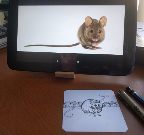The prompt Squeak made me immediately think of a cute little mouse… I decided to try my hand at drawing a mouse by looking at a photo of a mouse (rather than looking up ‘how to draw a mouse’)… I think he’s rather cute. 🙂 Along the horizon line I tangled the zentangle pattern Wibble…