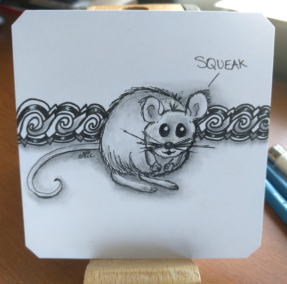 The prompt Squeak made me immediately think of a cute little mouse… I decided to try my hand at drawing a mouse by looking at a photo of a mouse (rather than looking up ‘how to draw a mouse’)… I think he’s rather cute. 🙂 Along the horizon line I tangled the zentangle pattern Wibble…