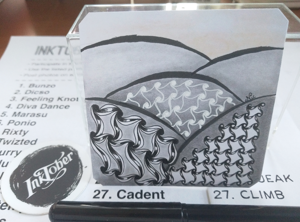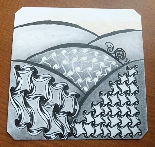 I really had no idea what to do for the prompt Climb, and I’ll admit that the zentangle pattern Cadent isn’t one of my favorite tangles (I typically am not a fan of grid tangles). So I drew some hills in pencil and decided to just do the zentangle thing and tangle in the spaces… then stuff happened as you can see… I started shading and using different pens… I even added a bit of yellow that was on the other end of my blending stub for a sunset-like horizon. I wasn’t really sure it conveyed Climb… but I had a long day and I figured the tile didn’t suck, so I called it a win. 😛