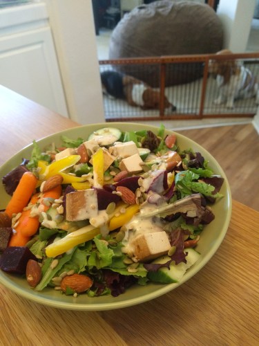 My memory is starting to freak me out (hopefully it’s just a side effect of perimenopause), my husband remembered a TED talk we had watched years ago about feeding your mitochondria by a doctor who had MS and was able to get out of her reclining wheelchair by changing her diet. As vegans, we liked the idea of eating 9 cups of fruits and vegetables in a more scientific way (eating the right foods for your brain)… so mid-Novemeber I started to implement eating 3 cups of leafy greens, 3 cups of sulfur vegetables, and 3 cups of colorful fruits/vegetables each day, even though I hadn’t fully read the book (Wahls Protocol)… but soon I realized that as a short woman this was more food than I could comfortably consume and figured out, thanks to Google searching the protocol, that petite women should only eat 6 cups (rather than 9)… and I am much more comfortable now. I was eating salads this size plus fruit for breakfast and cooked broccoli or cauliflower for dinner to meet my 9 cup requirement…