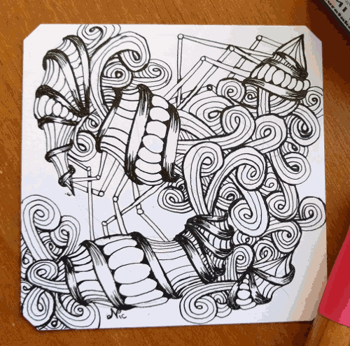 I played around with the tangles from my last zentangle project (Purk, Sand swirl, and Tink)… this time I didn’t use watercolors, instead I used copic grey markers and colored pencils… I also started the project with a dip pen and ink… I think it turned out really well 🙂