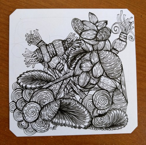 A few weeks back, I was watching an art video where they used Gesso on a coloring book page so that they could use watercolors to color the page. I was intrigued, and was thinking about how tiles I do zentangle on and some of my journal pages don’t do well with water mediums. So I decided to play and experiment…