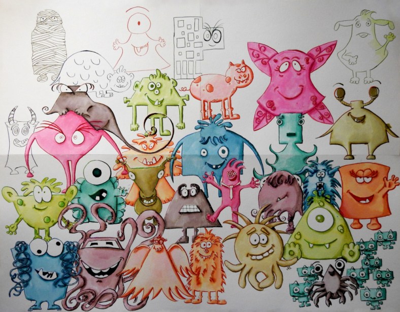 I had six monsters to create thick borders on the shadow side, fill in with color, and then shade with colored pencils, then finally highlight with gel pens… the thick lines and the filling-in required drying time, so I had to keep walking away and coming back later… but I actually finished it, and I’m so happy! 😀