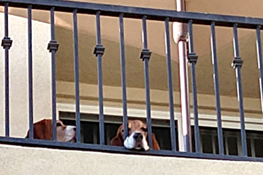 Here they are helping me dismantle the bed frame, Duke checking out the new balcony, and both pups looking down from the balcony…