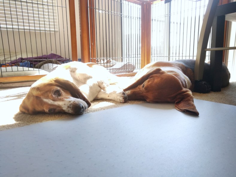 And for the people who come to my blog for the pups… Duke and Penny lounging under my desk (their playpen is in the background full of pillows and blankets).