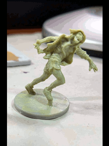 So I did the zombie lady in white (for close-ups, see previous post) , the dude in the orange overalls in black. Then I went searching for more colors online and somehow found myself in a reddit thread where I learned that primer is just gesso. Wait… what?! I have gesso! In fact, I have clear gesso! So I did the dude in purple shorts in clear gesso + zombie flesh, and then I did the dude in the suit in clear gesso. Just to see what worked and what didn’t…