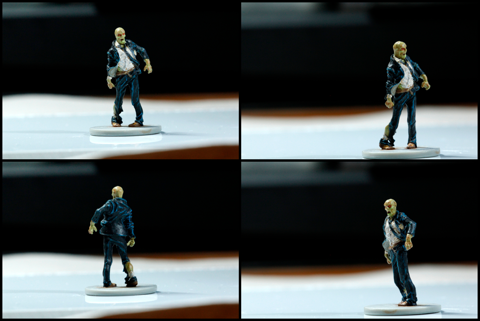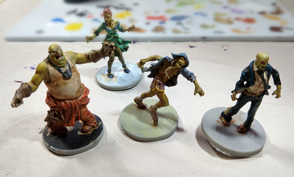 So I did the zombie lady in white (for close-ups, see previous post) , the dude in the orange overalls in black. Then I went searching for more colors online and somehow found myself in a reddit thread where I learned that primer is just gesso. Wait… what?! I have gesso! In fact, I have clear gesso! So I did the dude in purple shorts in clear gesso + zombie flesh, and then I did the dude in the suit in clear gesso. Just to see what worked and what didn’t…