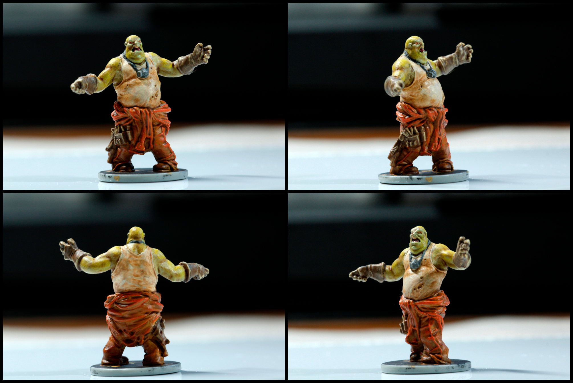 All of them worked just fine. The thing I found most informative was that which ever color you choose to prime in, be aware of what colors you plan to use… with the dude in orange having a white shirt but painted black first, it took a few extra coats of paint to get the shirt where I wanted it… luckily he’s a zombie, so dirty is fine, but had it been a cleaner character it might have been a problem. Oddly the dude in purple shorts who has a lot of zombie green felt like I was working really hard to hide the green…. What I think works best for me was the neutral colors to start out with, then I could see more clearly where I still needed to paint the base colors. That’s just me, though. So I think I might stick with just clear gesso on the grey minis.