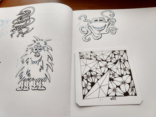 Thursday was not a good day… so Friday I decided to take a break and work on other things. The day off was nice, and some of the pressure that I didn’t realize I had, was lifted. Today, I did a little zentangle, and then drew the monsters for days 11 and 12… they don’t have names. Also my computer is having some issues, so my current blogging set up is a bit different, so I’m only posting one photo to keep it simple.