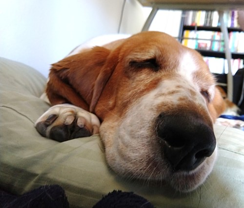 We took the pups for a short car ride today… Duke didn’t loose his breakfast this time – woo!Ā Once home, they grabbed the bed under the desk and looked like they were glad to be home… Specifically: