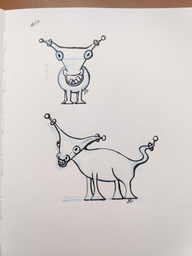 I didn’t have as much time today to devote to drawing, but I was able to get some time in… monster #16 is cute… I think she might be an alien cow… I’m thinking about calling her Candy Corn because of her triangular shaped head.Ā She looks kinda cool from the side, I’m pretty proud of this one…
